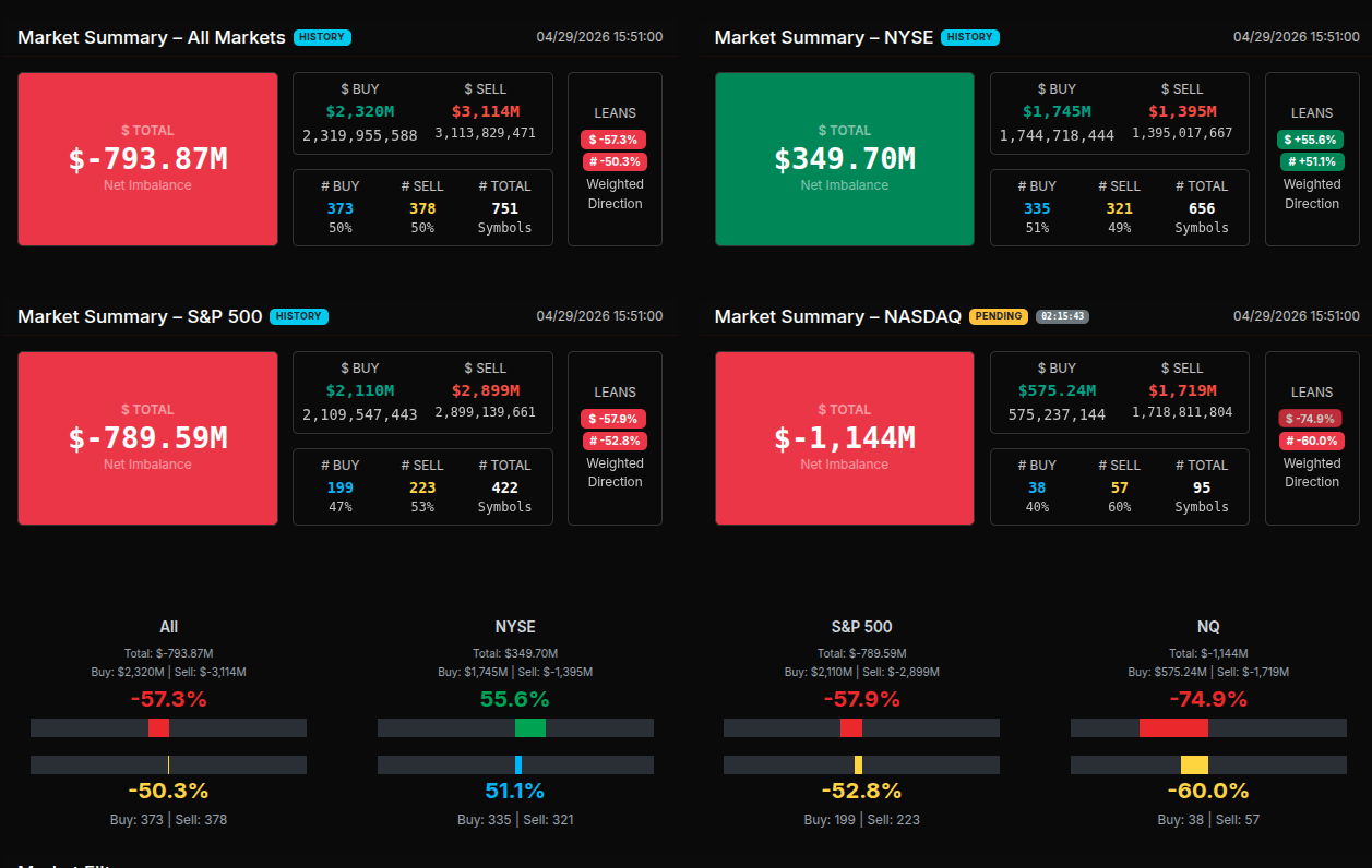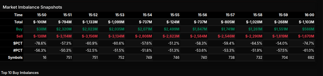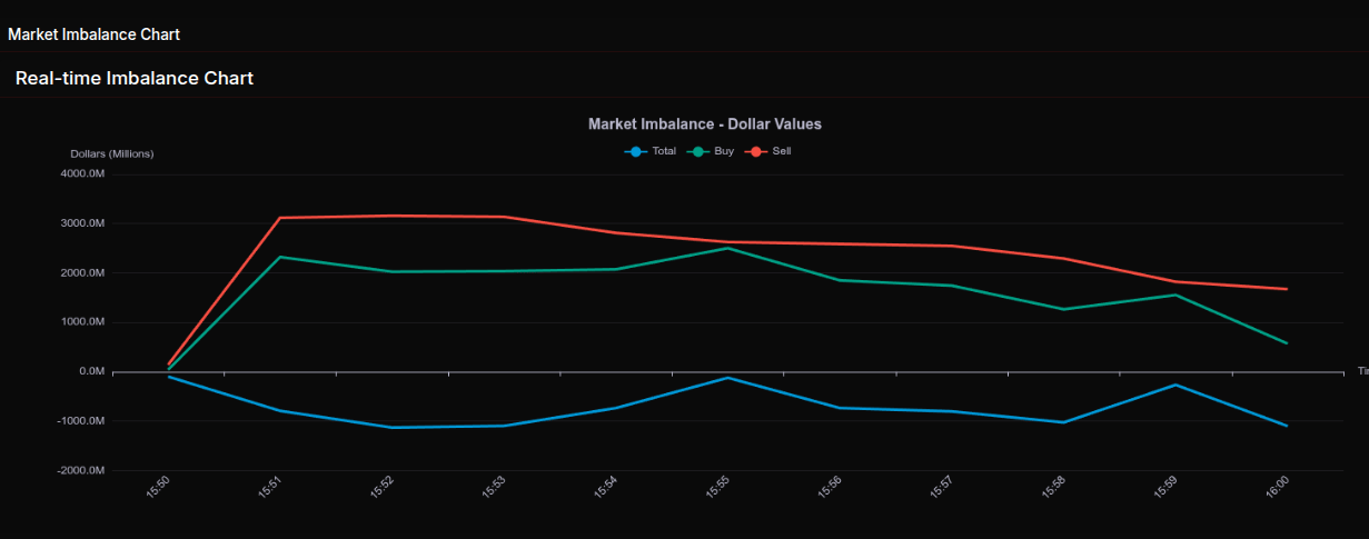 As the session progressed, there was a brief attempt at stabilization around 15:55, where total imbalance narrowed to roughly -$124M and the percentage leaned closer to -51%. This suggested some rotational activity, but the bounce lacked conviction. Sellers quickly regained control into the final minutes, with the close printing near -$1.1B and a -74.7% lean, firmly classifying the session as a wholesale sell program into the bell.