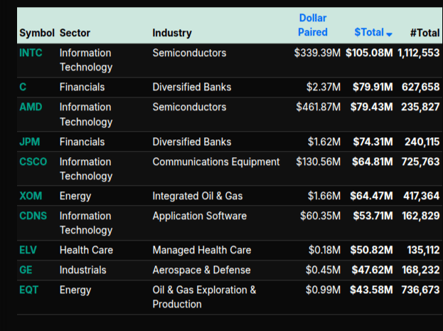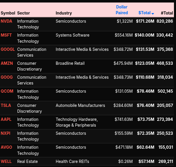 On the symbol level, mega-cap names dominated activity. NVDA, MSFT, GOOGL, and AMZN all appeared on the most active lists, reflecting large institutional repositioning. Semiconductor names like NVDA, AMD, and QCOM were heavily traded, aligning with the weakness in the Technology sector. Meanwhile, financial names such as JPM and C showed stronger buy imbalances, supporting the positive lean in Financials (+54.5%).