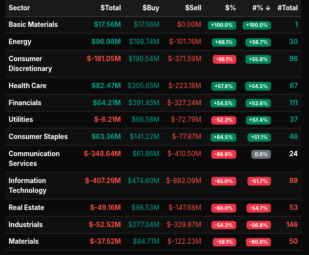 Sector flows confirmed this risk-off posture. Communication Services posted a notable -86.9% lean, while Information Technology saw heavy distribution at -65.0%. Industrials (-54.3%), Real Estate (-60.0%), and Materials (-59.1%) all showed strong sell-side pressure, reinforcing broad-based liquidation. On the other side, Energy stood out as an area of relative strength as it approached the +66% threshold, indicating near wholesale buying.