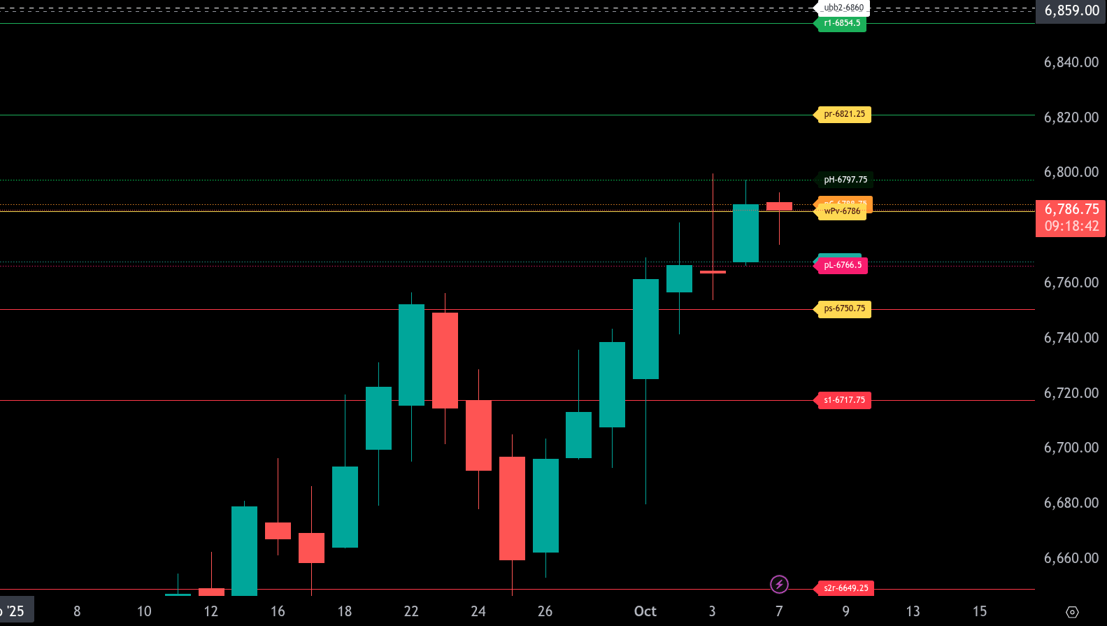If the price slips below 6786.00, the first support is seen at 6768.00, followed by 6766.50. Below that, the lower range target for today sits at 6750.75. A breakdown through 6750.75 would expose 6717.75 as the next key support.