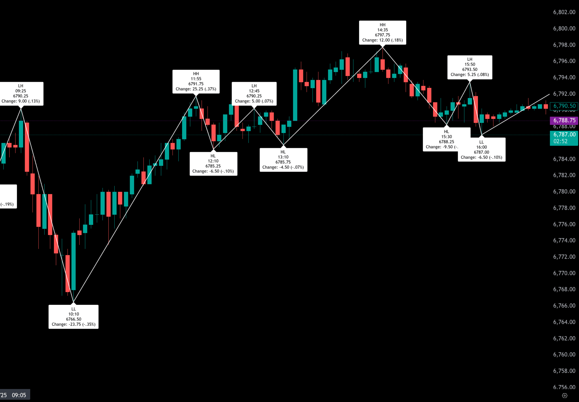 The overall market tone leaned neutral to slightly bullish. Early momentum from Globex carried into the open, but the failure to hold gains above 6795 showed a reluctance to chase highs ahead of midweek catalysts. The day’s cash-to-cash gain stood at +23.50 points (+0.35%), keeping the uptrend intact but with signs of short-term exhaustion.
