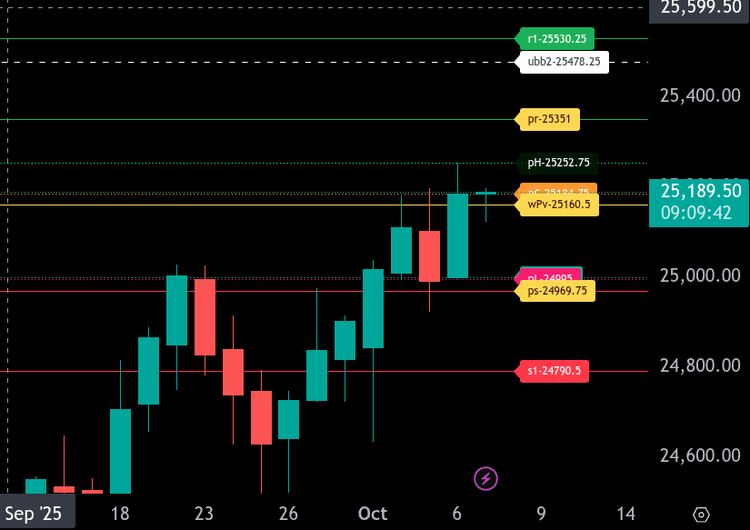 Currently, NQ is trading around 25,188.75, modestly above the bull/bear line, showing buyers have short-term control. If the market can sustain above 25,160.50, the next upside targets are 25,252.75 (pH) and 25,351.00 (pr), with a further stretch goal toward 25,530.25 (r1). The area between 25,351.00 and 25,530.25 marks potential intraday resistance and profit-taking zones.