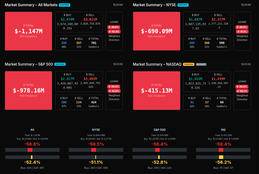 Monday’s MOC session opened balanced but quickly shifted toward persistent selling pressure, ending with a –$1.15 billion net imbalance across all markets. Total buy interest reached $2.67 billion, while sell programs totaled $3.82 billion, resulting in a weighted lean of –58.8%, signaling a strong institutional bias to the sell side. The breakdown showed –$690 million in NYSE names, –$978 million in S&P 500 components, and –$415 million on the NASDAQ.