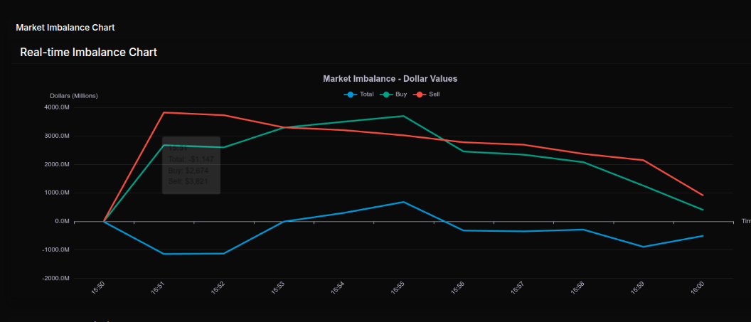 The imbalance trend through the 15:50–16:00 window confirmed broad liquidation pressure. Early readings around 15:51 ET showed roughly $3.8 billion in sells versus $2.6 billion in buys. A brief mid-session rotation near 15:54 ET lifted totals into positive territory ($+296 million) before sellers reasserted control into the close. By 16:00 ET, total sells settled near $3.8 billion, with only $2.3 billion in buys remaining.