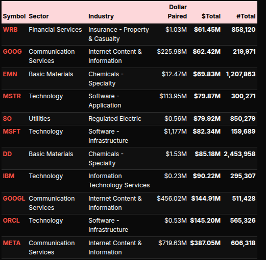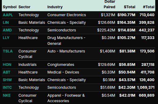 At the symbol level, selling was concentrated in mega-cap technology and communication names: AAPL (–$190.7M), GOOG (–$62.4M), and META (–$387M) all saw notable sell imbalances. Offsetting this were selective buys in LIN (+$164M) and LLY (+$105M), as well as TSLA (+$81M) in the cyclical group. These mixed signals highlight money rotating from high-momentum growth to more stable value and healthcare exposure.