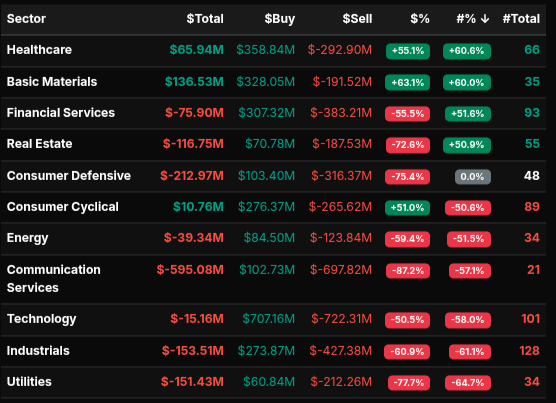 Sector participation reflected a defensive rotation. Basic Materials (+63%) and Healthcare (+55%) finished firmly on the buy side, showing targeted inflows. However, most sectors leaned negative: Communication Services (–87%), Utilities (–77%), and Consumer Defensive (–75%) led the selling with heavy outflows, each indicating wholesale institutional distribution. Technology, while slightly negative at –50.5%, showed signs of rotation rather than full-scale liquidation with 707 buys versus 722 sells.