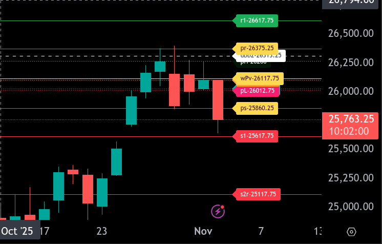 Overall, the market tone remains bearish below 26,117.75, but traders should watch for any stabilization near the 25,600 zone that could fuel a reactive bounce toward 26,000+. If buyers can push back above 26,117.75, it would mark an early shift in intraday sentiment.