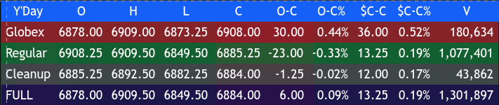 The afternoon saw choppy action: a drop to 6,876.50 at 2:40 p.m., a bounce to 6,887.50 by 3:09 p.m., and a final dip to 6,875.75 at 3:36 p.m. amid a $$-heavy sell imbalance at 3:50 p.m with ES sitting at 6,877.75. The cash close came in at 6,885.25, but after-hours saw a slide to 6,880.50 before settling at 6,882.25—up just 8.75 points or 0.13% on the day.