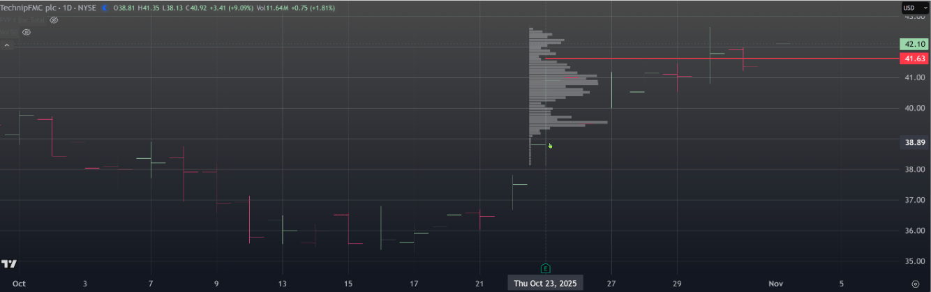 TechnipFMC is another strong performer within the oil services sector. The merged profile reflects a bullish distribution pattern beginning from the initial breakout. The red line may indicate the potential start of a new upward distribution phase. I am watching for a decisive and energetic breakout to confirm the continuation of this