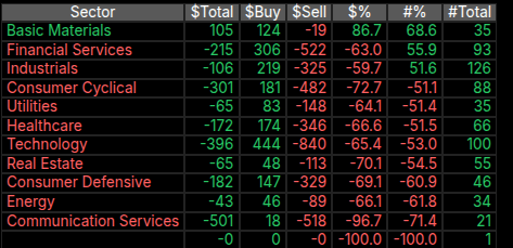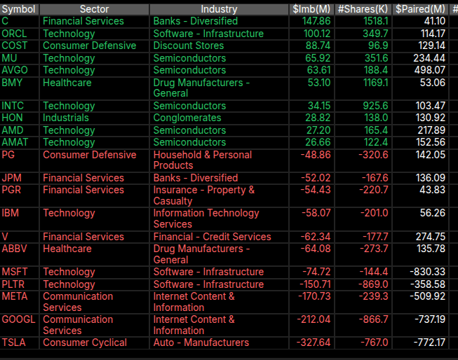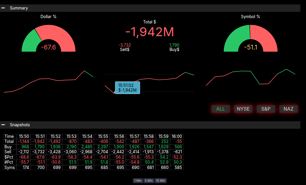 Despite the small index change, tone leaned defensive throughout Monday’s trade. The early rally to 6800.00 failed to attract continuation, and each rebound attempt into the afternoon met steady supply. Sector rotation tilted clearly bearish into the close. MiM data showed a strong sell imbalance of –$1.94 billion, with 67.6% of total imbalance dollars on the sell side and –51.1% of symbols skewed lower. Financials (–$215 M), Technology (–$396 M), and Communication Services (–$501 M) led sector outflows, offset partially by modest Basic Materials buying (+$105 M). Among single names, selling pressure centered on TSLA (–$327 M), GOOGL (–$212 M), META (–$171 M), and MSFT (–$151 M), while C (+$148 M) and ORCL (+$100 M) drew isolated buy interest.