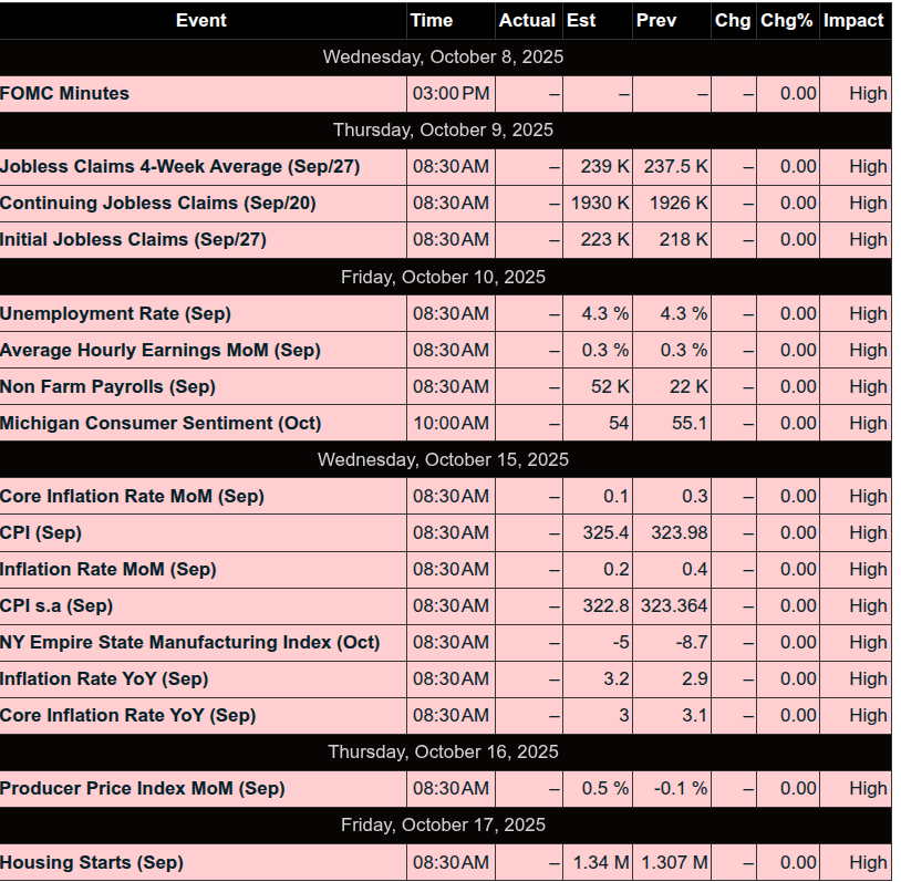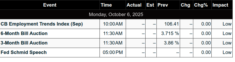 Markets: Despite political headwinds, Wall Street remains resilient. The S&P 500 and Nasdaq have now posted gains in four of the last five weeks. No U.S. economic data is due today. Fed minutes (out Wednesday) may offer insights into last month’s rate cut. September jobs report is delayed again.