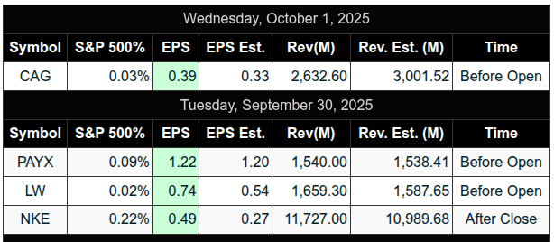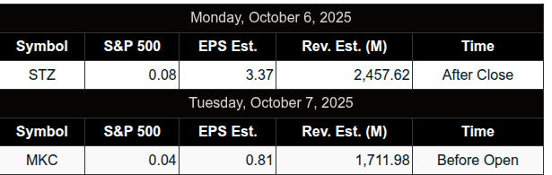 Corporate News: Tesla faces pricing pressure as the $7,500 EV tax credit expires. Musk hinted at a cheaper vehicle and teased an event for Tuesday. Q3 earnings pick up with reports from PepsiCo, Delta, Levi Strauss this week. Constellation Brands reports after the bell today.