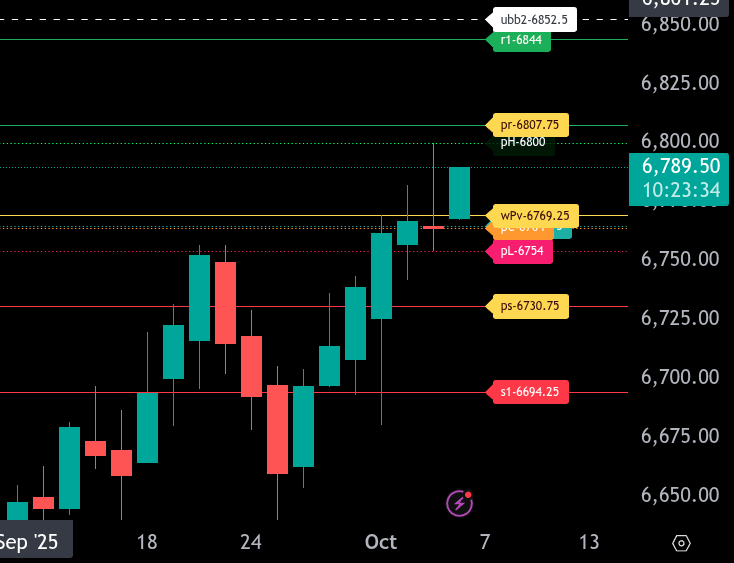 Overall, the tone is constructive while holding above 6769.25. Dips into the 6765–6770 zone may offer long opportunities as long as price remains above the bull/bear pivot. A move back under 6754.00 would shift the short-term outlook to bearish and set up a potential retest of 6730.75 or lower.