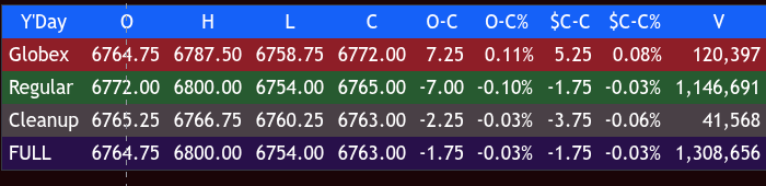 On Friday, the ES made a low at 6754.00, rallied up to 6800.00 at 12:18, chopped around not far off the highs, and then sold off down to the 6754 area at 1:51. It rallied up to 6776.25 at 2:27, pulled back to 6765.60 at 2:54, then rallied up to a 6775.75 double top at 3:39. It traded 6772.50 as the 3:50 cash imbalance showed $1.9B to sell, traded 6765 on the 4:00 cash close, and settled at 6764.00, down 2.75 points or -0.04%.