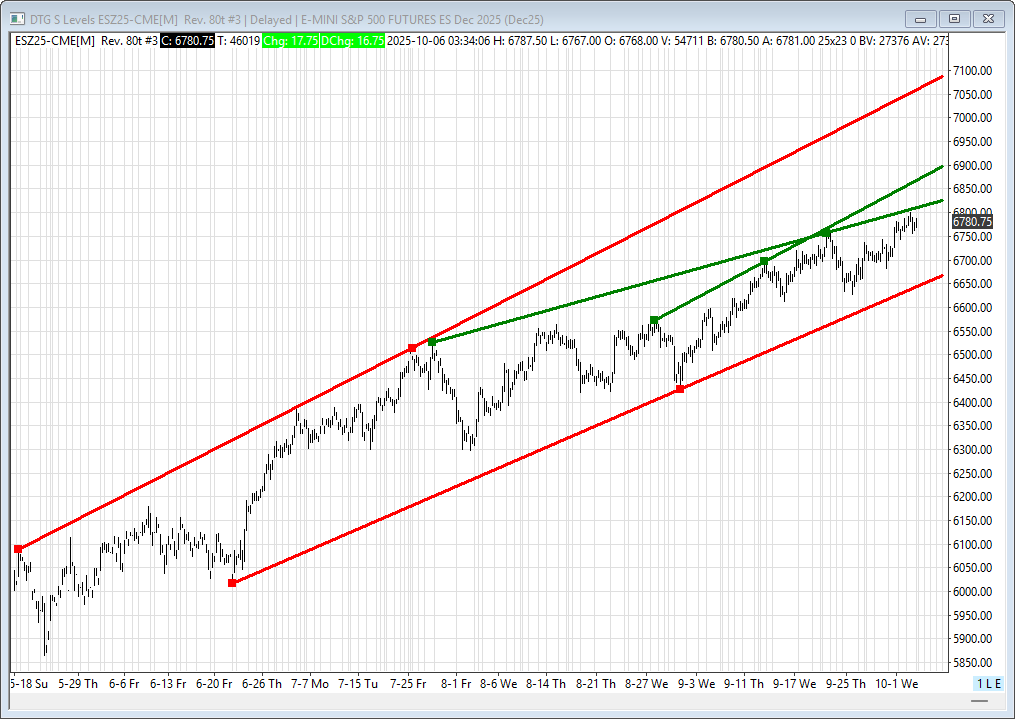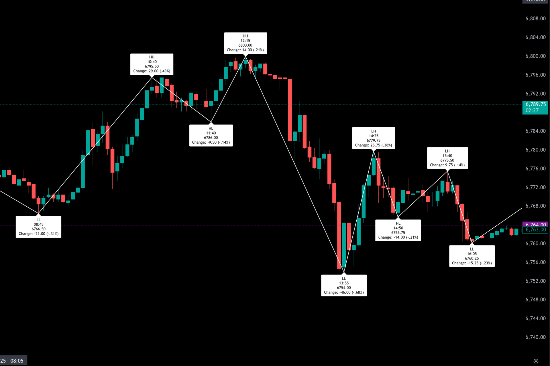 The ES began Thursday’s overnight session with a muted performance. Globex opened Thursday evening at 6764.75 and quickly dipped to 6758.75 by 6:30 PM before buyers stabilized the tape. From that early low, the contract rallied through the Asian and European sessions, climbing steadily to 6784.25 at 1:40 AM. After a shallow pullback to 6776.75 at 2:00 AM, the rally resumed into the early-morning European hours, peaking at 6787.50 by 5:50 AM. Sellers emerged from that point, pressing ES back down to 6766.50 by 8:40 AM—establishing a low just before the New York open.