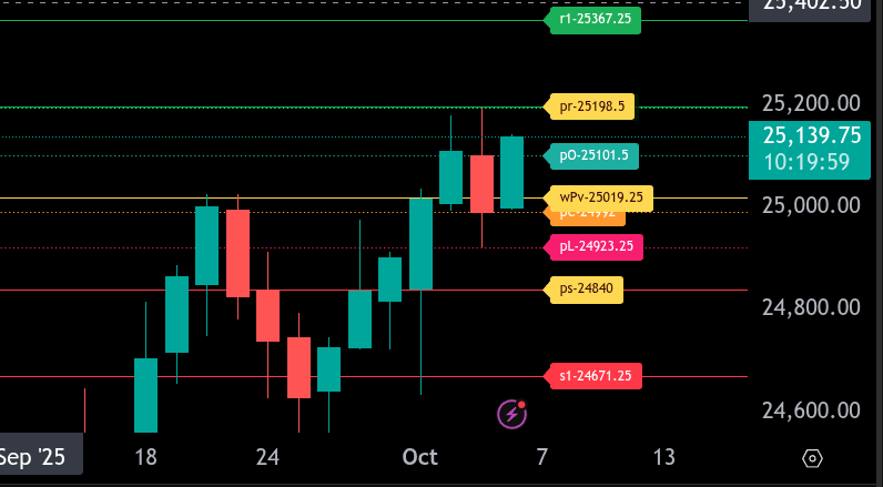 On the downside, initial support sits at 24,992, followed by the lower range target at 24,840. A break below 24,840 would expose deeper support near 24,671.25 (S1), which could accelerate downside momentum.