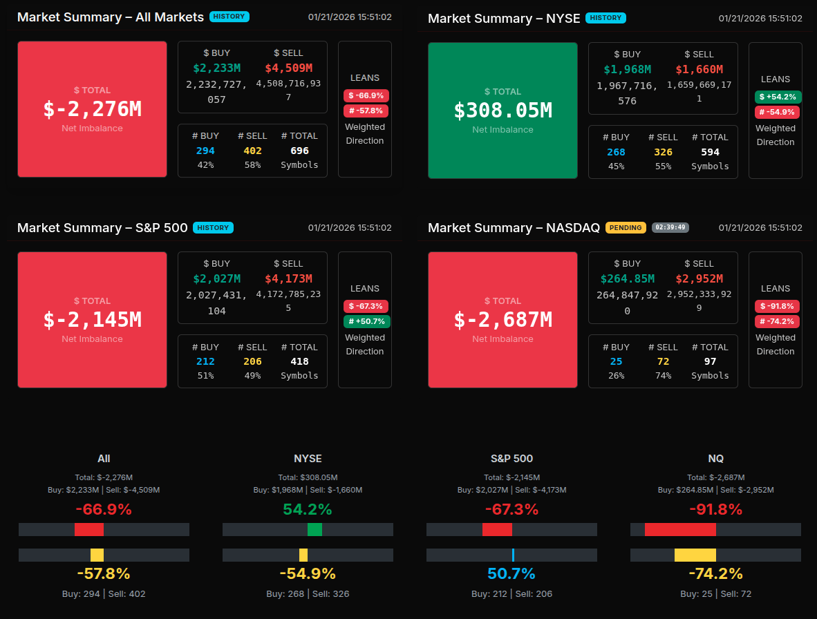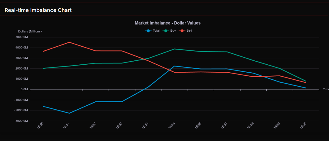 The Market-on-Close (MOC) auction opened with a heavy sell imbalance and stayed pressured through the early snapshots before a sharp late rotation altered the tape. At 15:50–15:53, total imbalance deepened from roughly -$1.6B to -$2.3B, with sell pressure dominating and dollar-weighted leans near or beyond the -66% threshold—signaling wholesale selling rather than simple rotation. As the auction progressed, buy programs accelerated into 15:54–15:57, flipping the dollar imbalance positive briefly and pushing buy-side dollar flow toward $3.8B–$3.9B. The close settled with a modest residual imbalance, reflecting late-day rebalancing rather than sustained accumulation.