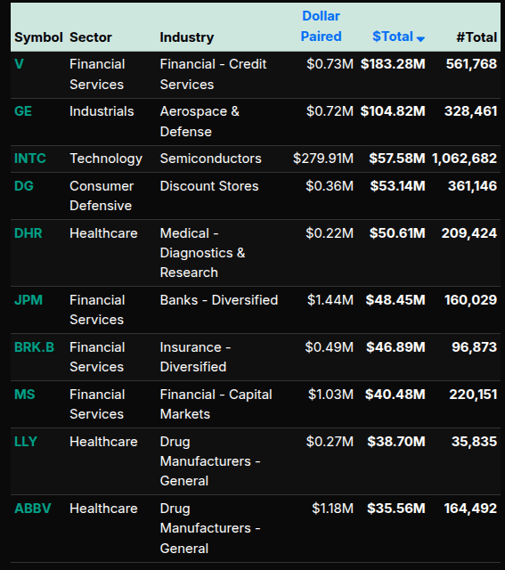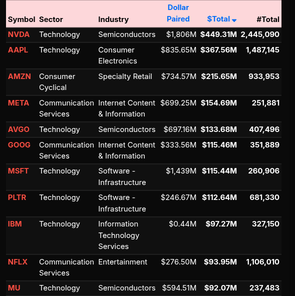 Single-name flows were concentrated in megacap technology and index bellwethers. NVDA and AAPL led total dollar volume, followed by AMZN, META, AVGO, GOOG, and MSFT—confirming that index and ETF rebalances drove much of the auction. Financials such as V, JPM, BRK.B, and MS also attracted notable buy-side interest, aligning with the sector-level rotation.