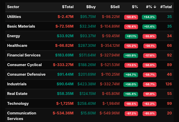 Sector behavior was bifurcated. Technology and Communication Services carried the most pronounced sell leans, with Technology registering an extreme negative lean near -88% and Communication Services approaching -97%, both indicative of broad-based institutional selling. Consumer Cyclical also showed a strong sell skew (approximately -74%), reinforcing risk-off behavior into the close. In contrast, Financial Services, Energy, Industrials, Real Estate, and Consumer Defensive posted positive dollar leans above +60%, consistent with rotation and index-related balancing rather than outright risk-on demand. Utilities and Basic Materials leaned negative, though closer to the -50% area—more rotational than wholesale.