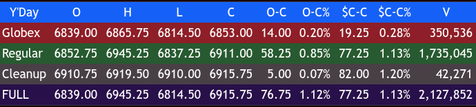 After the high, the ES sold off down to 6904.25 at 3:31, then rallied up to 6918.50 at 3:38, sold back off down to 6908.50 at 3:46, rallied up to 6913.50 and traded 6912.25 as the 3:50 imbalance showed $2 billion to sell closing out the regular session at 6910.75. After 4:00, the ES hit 6919.50 and settled at 6917.75, up 86.25 points or 1.26%. The NQ settled at 25,509.50, up 380.25 points or +1.51%, the YM settled at 49,281.00, up 615 points or +1.26%, and the RTY settled at 2,712.10, up 53.40 points or 2.01% on the day.
