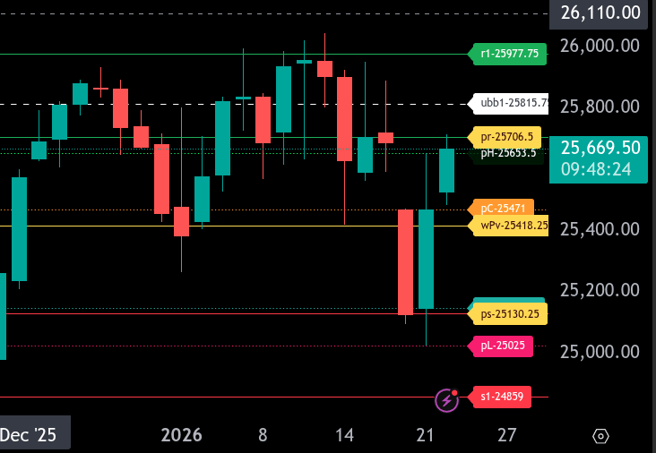 On the upside, resistance is defined at the upper range target of 25,706.50, with the next target sitting at 25,977.75. If price can reclaim and hold above 25,706.50, continuation toward the upper range target becomes likely.