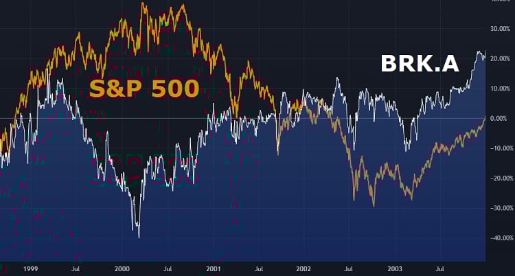 After all, Buffett outperformed through the dot com crash. But he still suffered pretty significant drawdowns from 1998 to 2001 …