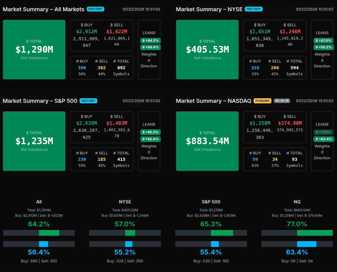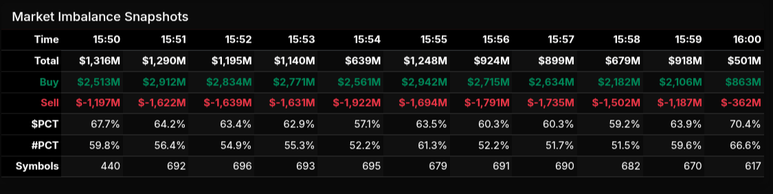 By the close, the final net imbalance printed just over $500M, a natural taper as paired volume increased into 16:00. Importantly, both dollar-weighted and symbol-weighted percentages remained firmly positive, confirming that the buy imbalance was broad-based rather than isolated to a handful of names.