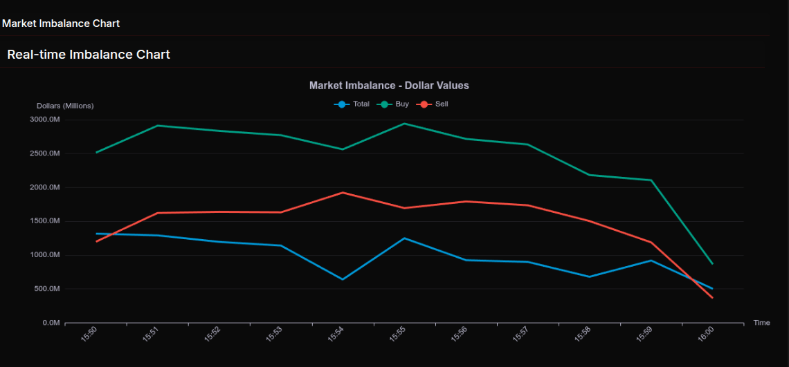 The Market-on-Close auction opened with a clear buy-side bias that remained intact throughout the final ten minutes, though the path was not linear. Early snapshots around 15:50–15:52 showed total imbalances holding above $1.1B, with buy dollars consistently north of $2.7B while sell interest hovered near $1.6B. As the auction progressed, total imbalance briefly compressed near 15:54 before re-expanding into 15:55, signaling renewed institutional participation rather than exhaustion.