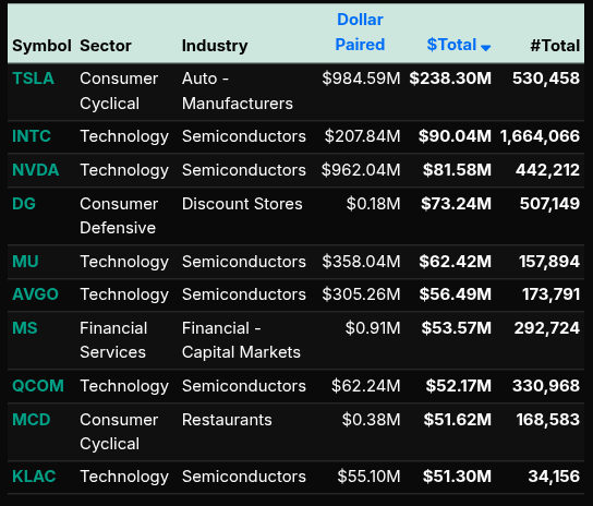 Single-stock activity highlighted where size was concentrated. Large buy imbalances were visible in TSLA, INTC, NVDA, and several semiconductor names, reinforcing the Technology sector’s leadership. Defensive and healthcare-related names appeared more frequently on the sell side, aligning with the sector summary.