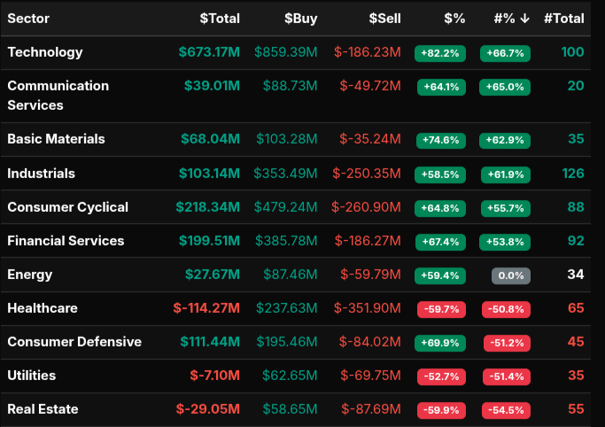 Sector-level flows reinforced this constructive tone. Technology dominated, posting a $673M net total with dollar and symbol leans well above 66%, a hallmark of wholesale institutional buying. Consumer Cyclical and Financial Services followed with strong positive leans, while Industrials also saw heavy gross activity despite meaningful offsetting sells—suggestive of rotation rather than outright risk-off behavior. Basic Materials participated constructively, adding to the cyclical bid.