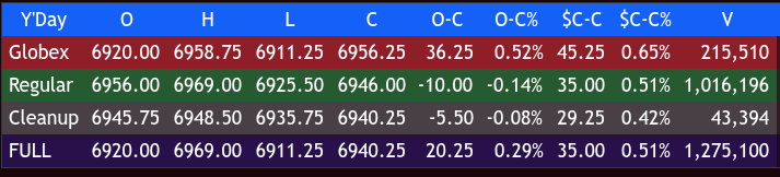The ES traded up to 6951.75 at 10:45, pulled back to the VWAP at 6941.75, rallied up to 6962.25 at 11:50, pulled back to 6951.00 at 12:00, and then rallied up to a new high at 6969.75 at 1:00. After the high, the ES pulled back to 6955.25, rallied up to 6966.50 at 2:10, sold off down to 6932.50 at 3:32, traded 6942.50 as the 3:50 cash imbalance showed $1.3 million to buy, traded up to 6947.75, traded 6946.00 on the 4:00 cash close and settled at 6940.25.