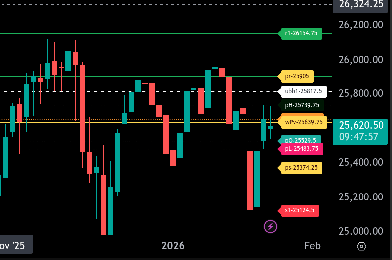 On the upside, initial resistance is 25,658.25, then 25,739.75. Above that, 25,817.50 is a key resistance zone, with the upper range target at 25,905. Acceptance above 25,905 would shift the tone more neutral to bullish.
