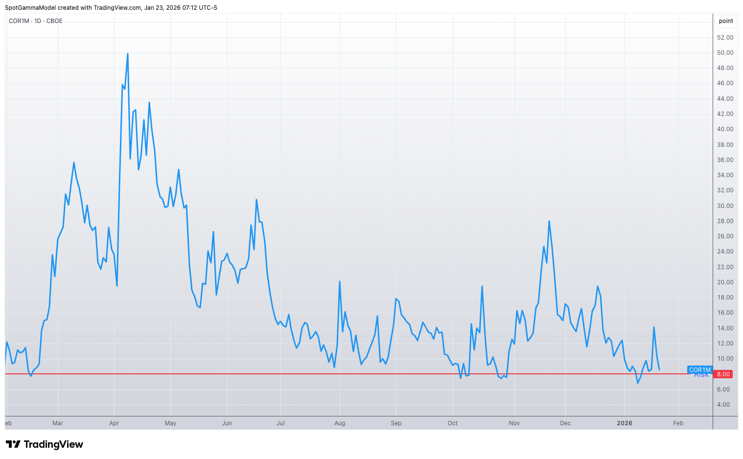 …and COR1M (equity correlation) is flagging that single stock calls are bid. On this topic COR1M is near our “we should buy some puts” level of <=8. We think that it likely crosses that threshold today or Monday. This metric at our “Risk-Off” level, with cheap VIX call spreads (as signaled by VVIX) makes the setup for either owning ~1-month out VIX call spreads and/or 1-2 month out SPX put spreads much more palatable.