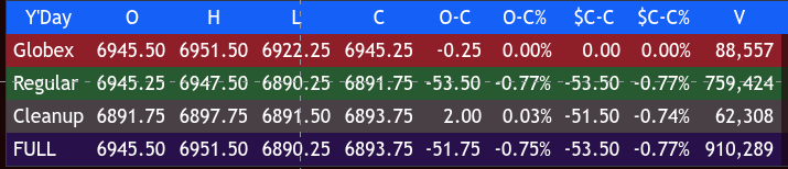 The bull/bear line for the ES is at 6903.75. This is the key pivot for today’s session. Acceptance above this level keeps buyers in control, while sustained trade below it favors sellers.