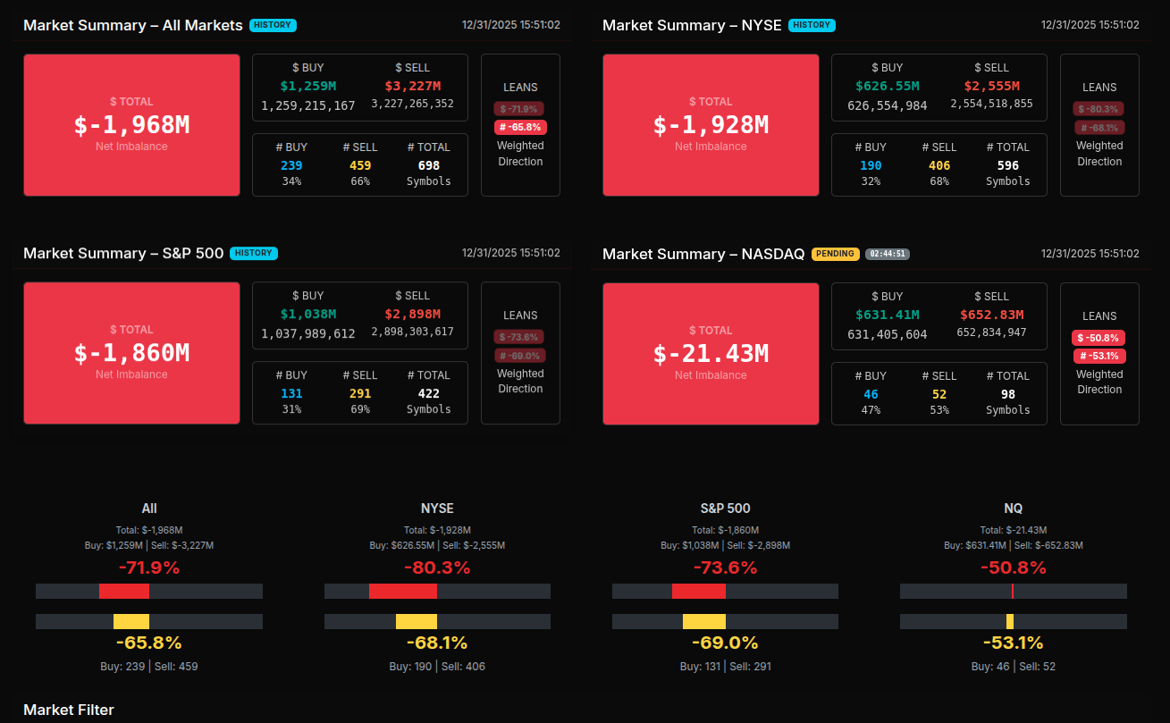 The market-on-close auction finished the final trading session of the year with a clear and persistent sell imbalance that never meaningfully stabilized. From the opening of the MOC window, sell-side pressure dominated and accelerated into the heart of the auction, reflecting broad institutional de-risking rather than tactical rebalancing.