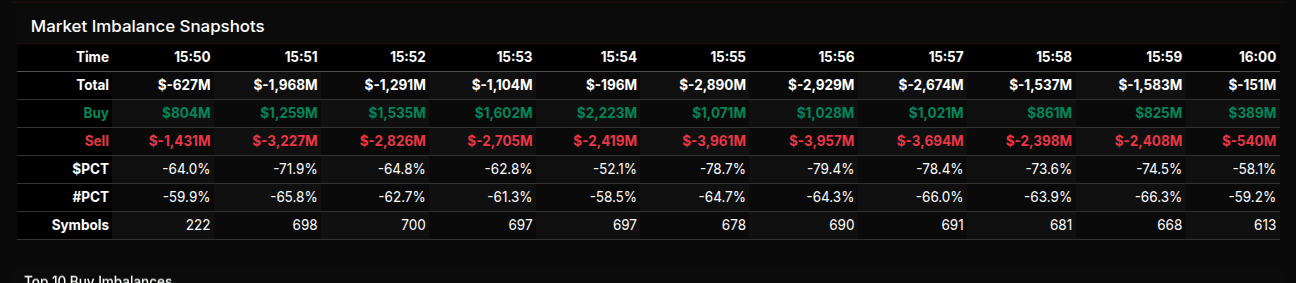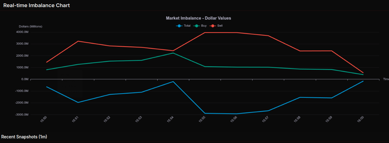 Early snapshots around 15:50 already showed a sizable net sell imbalance near $627M. As participation ramped up between 15:51 and 15:56, the imbalance deepened sharply, reaching a peak near $2.9B to the sell side. Dollar-weighted sell percentages consistently pushed beyond -70%, with several prints nearing -80%, signaling wholesale selling rather than rotation. Although buy dollars briefly increased mid-auction, they failed to offset the magnitude of sell programs. The final print moderated to roughly $151M net sell, but this was more a function of late matching than a shift in intent.