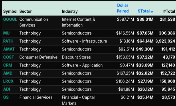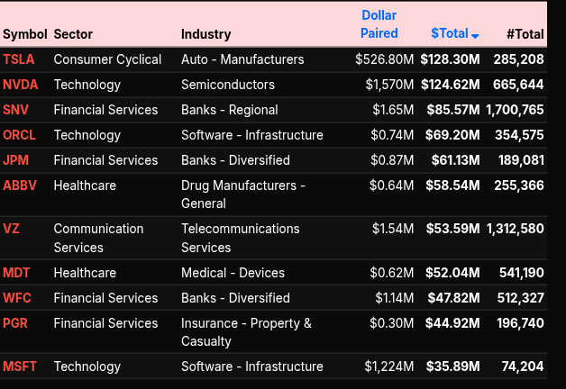 On the symbol level, large-cap and mega-cap names dominated activity. Selling pressure was evident across banks, industrials, and healthcare leaders, while technology flow was mixed, skewing more rotational than outright accumulation. Notably, symbols with leans closer to -50% reflected internal rotation within tech rather than aggressive liquidation.