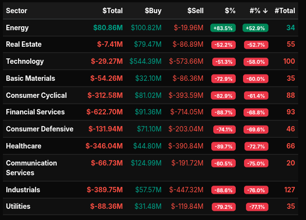 Sector data reinforced the risk-off tone. Financial Services, Healthcare, Industrials, and Consumer Cyclical all posted extreme negative leans well beyond -66%, marking them as institutional sell targets. Financials led the downside with over $620M net sold and a -88% lean, while Consumer Cyclical and Healthcare followed closely. Basic Materials and Utilities also showed heavy selling, adding to the defensive posture. Energy was the lone standout, posting a strong positive imbalance with an +83% lean, suggesting selective accumulation rather than broad sector strength.