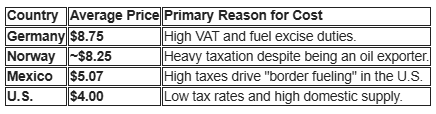 • Infrastructure Strategy: While countries like Germany and France use high fuel taxes to fund public transit and green initiatives, the U.S. maintains lower rates to support its car-centric culture, where the average driver travels 13,000 miles annually.