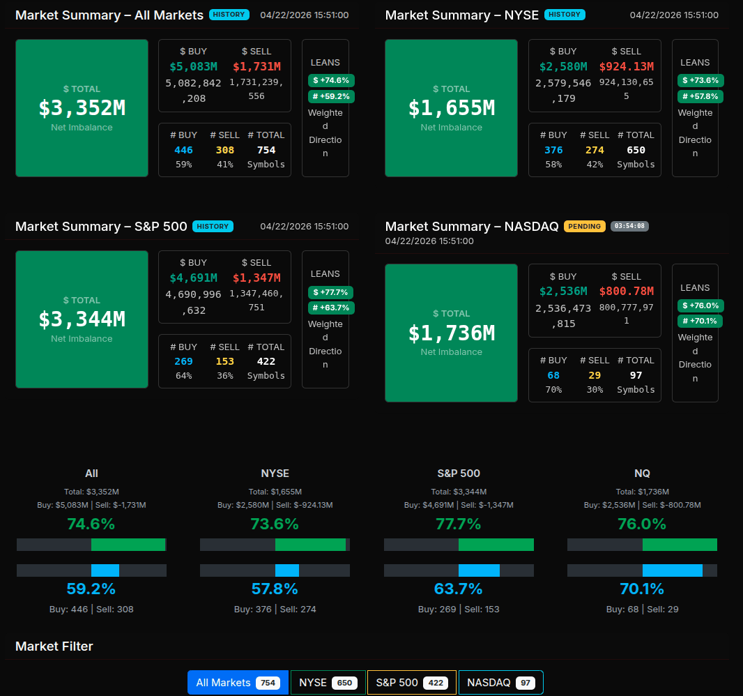 As the session progressed into the final minutes, there was a gradual fade in total imbalance—from the $4B+ range down toward $951M into the close—but importantly, the buy-side dominance remained intact. Even at 16:00, the imbalance still leaned roughly +64.5%, showing that while participation thinned, directional conviction did not fully unwind.