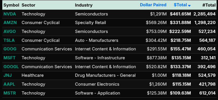 At the symbol level, flows were concentrated in mega-cap leadership. NVDA (+$461M), AMZN (+$331M), AVGO (+$222M), and TSLA (+$218M) led the buy programs, alongside strong participation in GOOG/GOOGL and MSFT. Semiconductors were particularly dominant, with names like MRVL, QCOM, INTC, and LRCX all seeing steady demand. META also stood out on the communication side, reinforcing the tech-heavy bid.