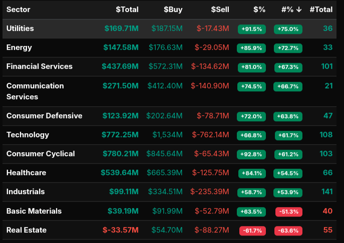 Sector flows reinforced this strong buy-side narrative. Leadership came from Consumer Cyclical (+92.8%), Utilities (+91.5%), and Energy (+85.9%), all showing broad accumulation. Financials (+81.0%) and Communication Services (+74.5%) also contributed meaningfully, suggesting a risk-on posture across both defensive and growth areas. Technology printed a +66.8% lean, right at the threshold of trend, indicating strong but slightly more two-way participation relative to other sectors. The only notable outlier was Real Estate at -61.7%, reflecting a clear pocket of distribution.