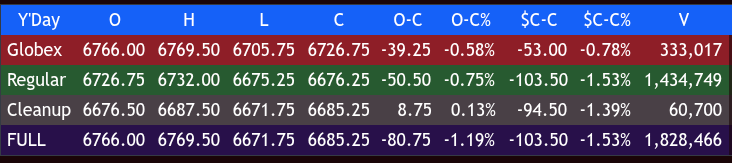 It was another night of ugly Globex and day session trade. The ES traded down to 6705.75, rallied up to 6769.50, and opened Thursday’s regular session at 6726.75, down 53 points or -0.79%.