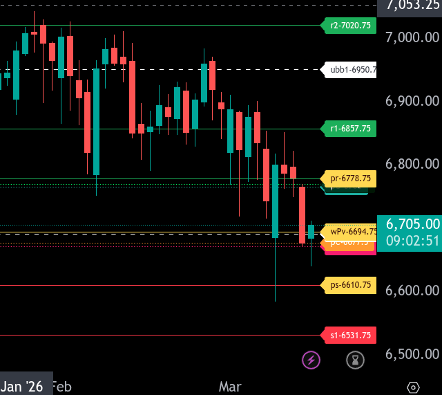 There is a significant technical gap between the Session Low ($6,671.00$) and the 1st Support Point ($6,643.00$). If the Value Area Low ($6,684.00$) fails, the move down could be rapid until it hits that $6,643$ pivot.