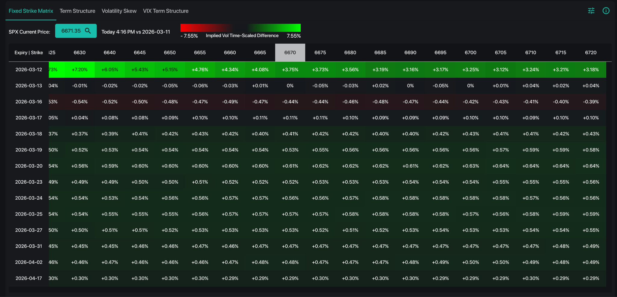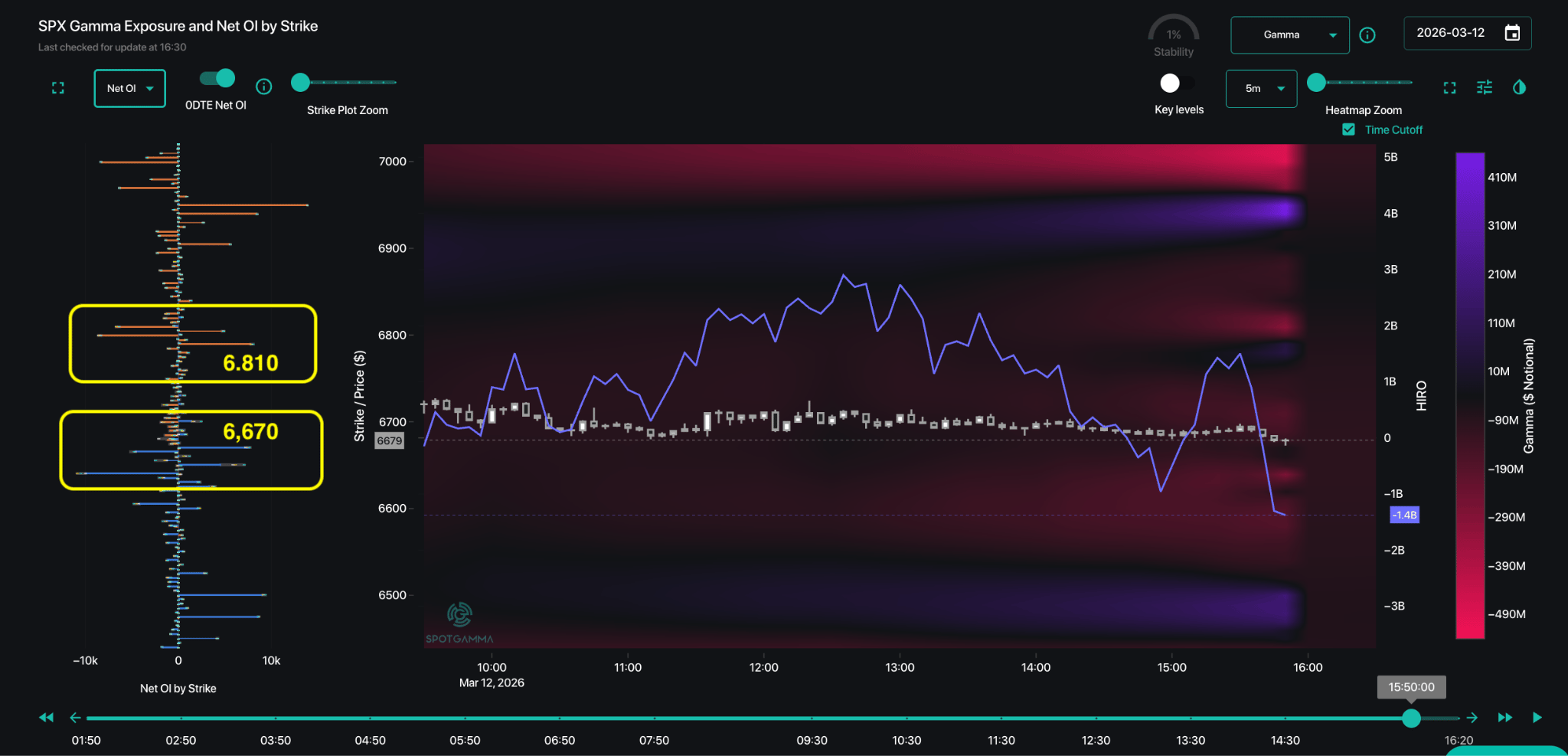 When toggling to 0DTE Net OI, we can see the positions responsible for the day’s 0DTE gamma exposure. A 0DTE iron condor centered around 6,670 and 6,810 opened again around 10:00am ET. These positions appeared more complex than the prior iron condor structures observed earlier in the week.