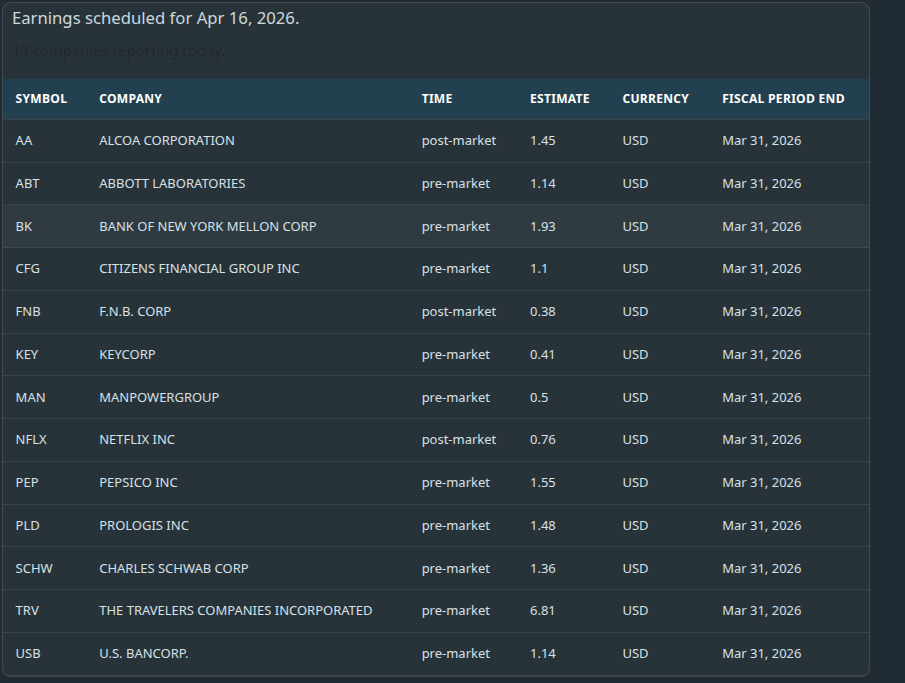 Pre-market: ABT, BK, SCHW, CFG, KEY, PEP, PLD, SNA, TSM, TRV, USB, WIT