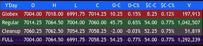 After 4:00, the ES sold off down to 7054.25 and settled at 7060.50, up 55.75 points or +0.80%, up 10 of the last 12 with 1 down only 8 points and 1 unchanged.