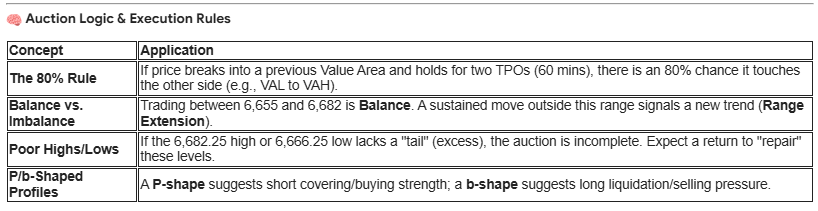 • 6,666.25 (Session Low/IBL): Initial Balance Low. Watch for Excess (buying tails) here to confirm floor strength.