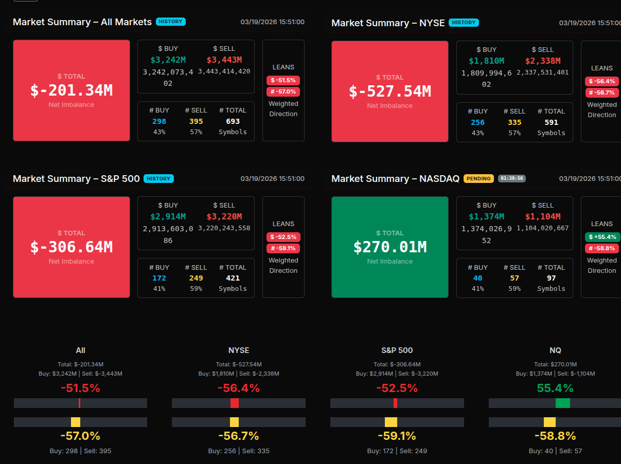 Index summaries reinforced the theme: NYSE (-56.4%) and S&P (-52.5%) leaned heavily sell-side, while Nasdaq showed a notable divergence with a +55.4% buy skew. This divergence highlights internal rotation beneath a broadly negative closing auction, rather than a uniform risk-off event.