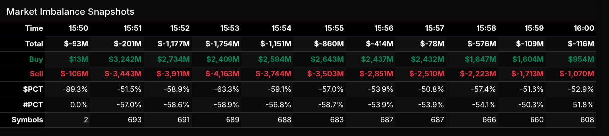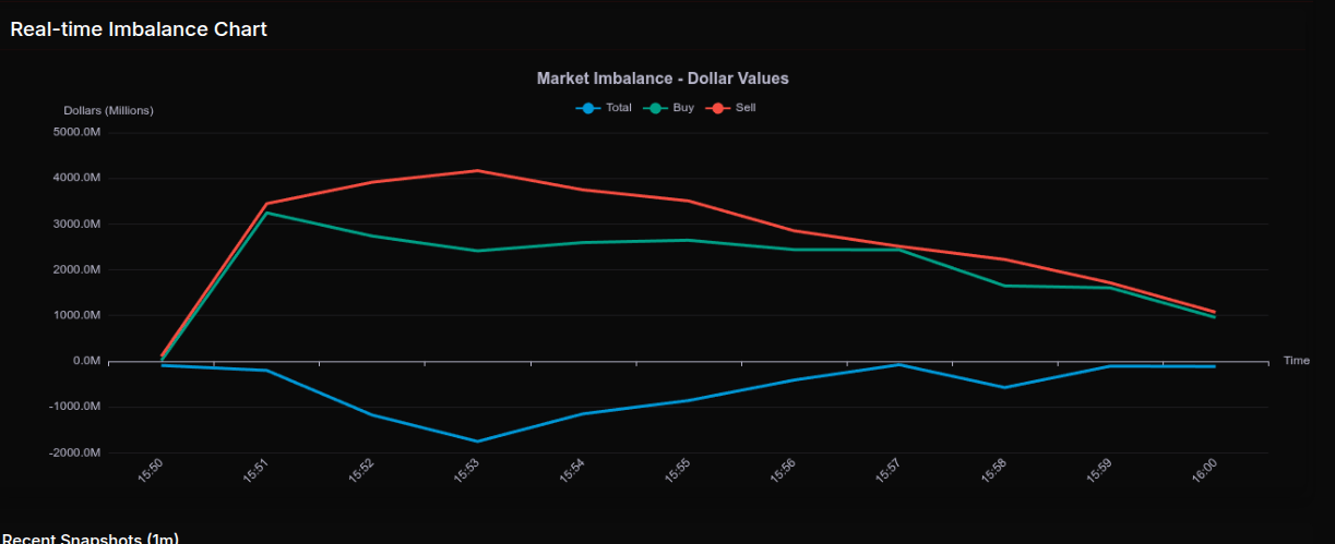 The MOC session developed with a clear sell-side tone that intensified quickly after the initial imbalance prints. At 15:50, the market opened modestly negative at -$93M, but within one minute expanded aggressively to -$1.17B and ultimately bottomed near -$1.75B by 15:53. This early expansion established a decisive sell program, with $PCT readings pushing as low as -63.3%, indicating broad and directional institutional supply rather than rotational flow.